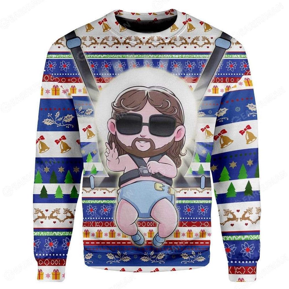 Baby Jesus Ugly Christmas Sweater – An Ugly Christmas Sweater is a festive garment often characterized by its loud, over-the-top design and a playful sense of humor. These sweaters typically feature an array of colorful, holiday-themed patterns, such as Santa Claus, reindeer, snowflakes, and Christmas trees. The designs can be adorned with quirky embellishments like sequins, pom-poms, and even battery-operated lights, making them a focal point of any holiday gathering. The charm of an Ugly Christmas Sweater lies in its deliberate gaudiness and the fun spirit it embodies, turning it into a beloved tradition for holiday parties and gatherings.