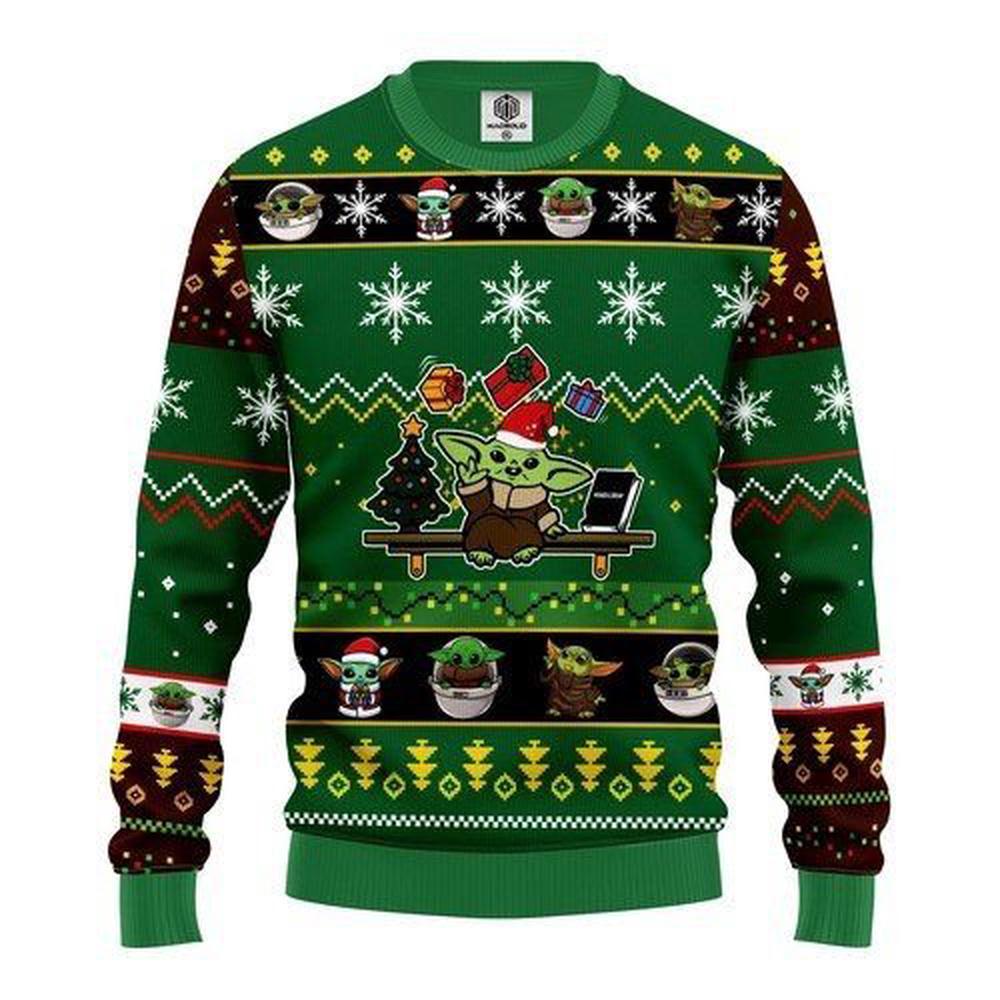 Baby Yoda Cute Ugly Christmas Sweater – An Ugly Christmas Sweater is a festive garment often characterized by its loud, over-the-top design and a playful sense of humor. These sweaters typically feature an array of colorful, holiday-themed patterns, such as Santa Claus, reindeer, snowflakes, and Christmas trees. The designs can be adorned with quirky embellishments like sequins, pom-poms, and even battery-operated lights, making them a focal point of any holiday gathering. The charm of an Ugly Christmas Sweater lies in its deliberate gaudiness and the fun spirit it embodies, turning it into a beloved tradition for holiday parties and gatherings.
