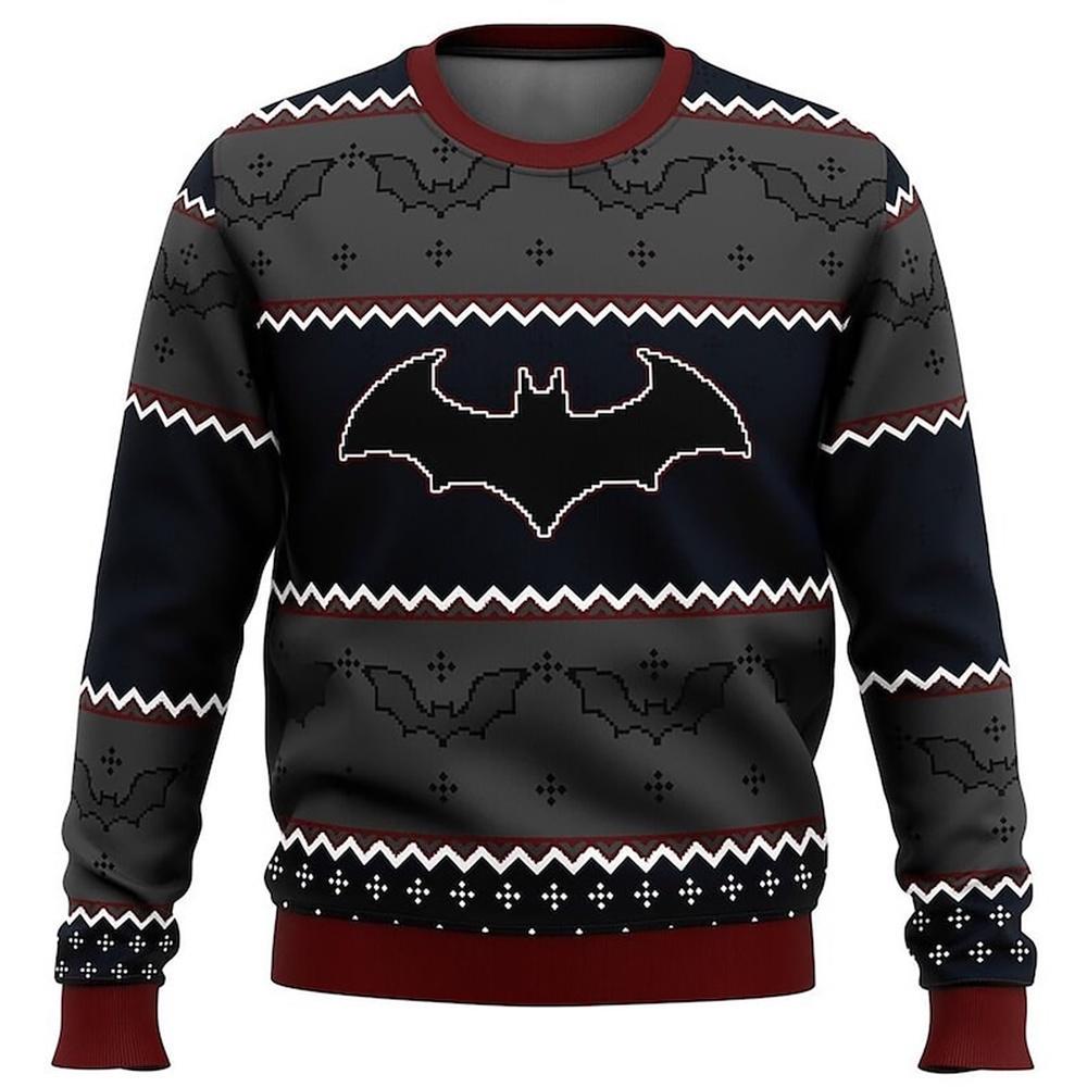 Batman Dark Ugly Christmas Sweater – An Ugly Christmas Sweater is a festive garment often characterized by its loud, over-the-top design and a playful sense of humor. These sweaters typically feature an array of colorful, holiday-themed patterns, such as Santa Claus, reindeer, snowflakes, and Christmas trees. The designs can be adorned with quirky embellishments like sequins, pom-poms, and even battery-operated lights, making them a focal point of any holiday gathering. The charm of an Ugly Christmas Sweater lies in its deliberate gaudiness and the fun spirit it embodies, turning it into a beloved tradition for holiday parties and gatherings.