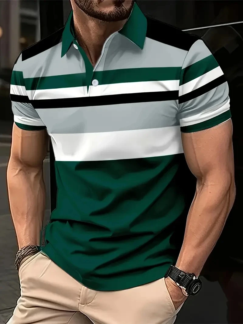 Men’s Casual Stripesd 3D Printed Golf Shirt, Short-Sleeved Button Collar Knitwear, Regular Version Polyester Fiber Polo Shirt, S