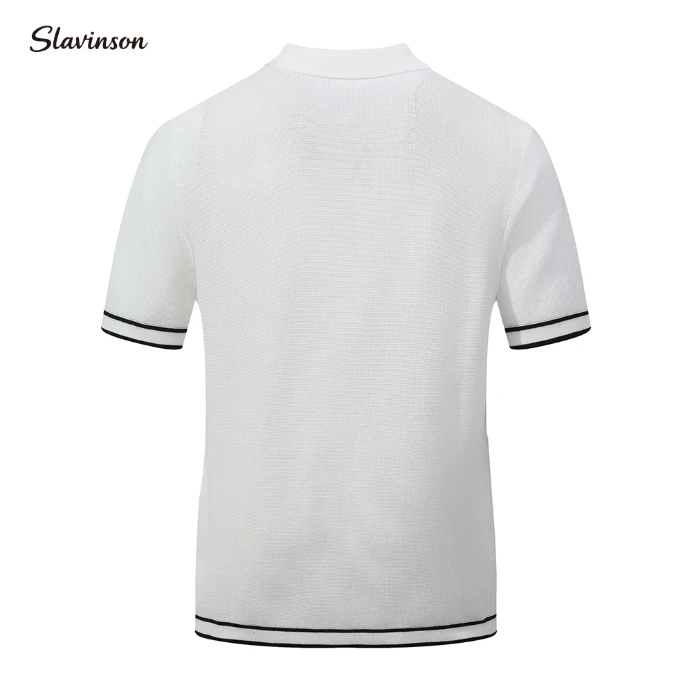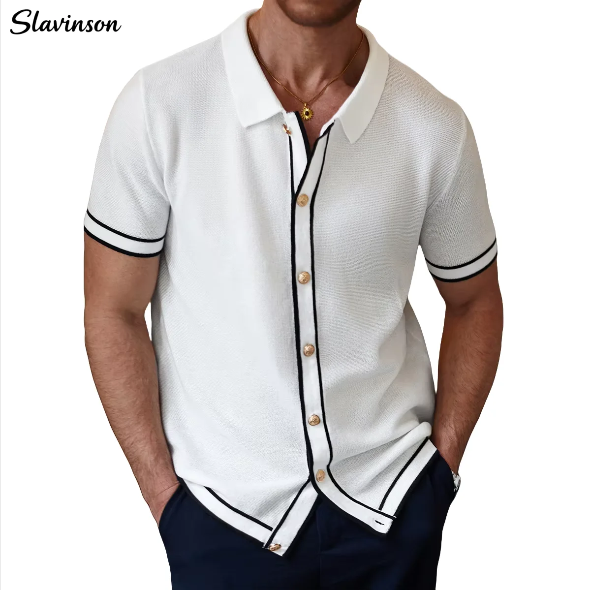 Slavinson Men’s Polo Shirts 2025 Summer Mens Retro Knit Lapel Striped Brand Fashion Short-Sleeved Casual Slim Tops US Size